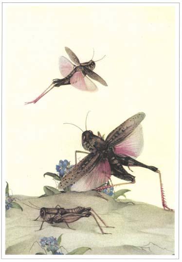 那群昆虫吃得饱饱的,在网罩中趴在太阳底下,悠然自得地消化肚里的美食,它们除了轻轻地摇摆几下触须,懒得做任何其他活动。现在正值午间,炎热的天气让人直打瞌睡。过了好久,一只雄螽斯站起身开始神态庄重地漫步,还把鞘翅稍稍抬起,偶尔发出一两声“蒂克——蒂克”的声音。它逐渐加快歌唱的节奏,变得活跃起来,鸣唱出它最动听的乐篇。从表面上看,悠扬的歌声并没有得到听众的青睐,休息的照旧休息,啃食蝗虫的照旧啃着。可以肯定地说,歌手只是用鸣唱来抒发生活的乐趣。