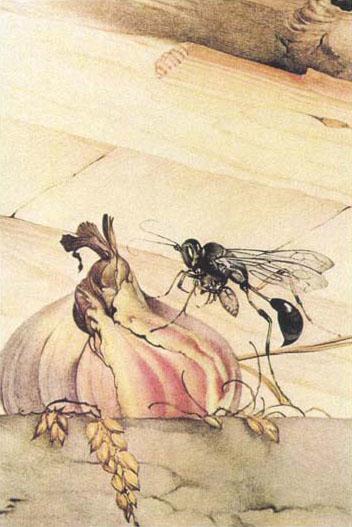 过了几天,事情稍稍有了进展。强健有力的雌螽斯把产卵管抬起来,高高翘起后腿,将它的丈夫打翻在地,接着把它压在身下紧紧地勒住。可怜的雄螽斯,竟以这样的姿势屈就,显然,它不是胜利者。雌螽斯毫不顾及雄螽斯,粗暴地掀开它的鞘翅,在肚子上啃咬起来。如今通常的被挑逗者成了挑逗者,女伴粗暴地抚摸能够让对方皮开肉绽。它咄咄逼人地制服了对方,使它的爱人慌乱不安,而被打翻在地者似乎想反抗,乱蹬乱踢。