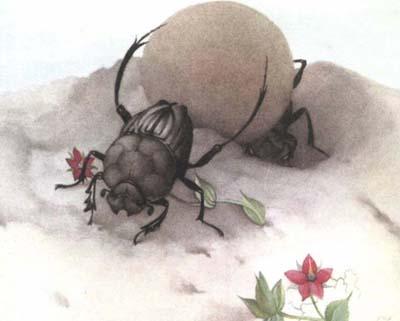 在一堆粪便的四周,是一番热火朝天的忙碌景象!气温还不是很高,几百只各种各样的食粪虫已经蜂拥而至,吵吵嚷嚷地聚在那里,迫不及待地要在这美味上分得一杯羹。有的在露天梳耙着美味的表面;有的为了寻找更可口的美味,正在粪堆深处挖掘通道;有的在下层挖掘,以便能把战利品埋藏到附近的土中;个头小的则在一旁,将强壮的合作者在大规模挖掘时坍塌下来的小块粪便切碎;初来乍到的,也许是饥肠辘辘,就当场饱餐一顿。然而大多数还是想积攒一笔财富,藏到一个隐蔽的地方,以备不时之需。在长着百里香的贫瘠的平原上,这样的意外收获真是难得。方圆一公里飘溢着粪香味,使得所有的食粪虫都急匆匆向这里赶来。