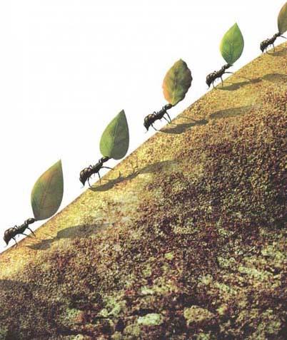 法国的七月干燥少雨,地面会出现一些裂缝,动物们都疲惫无力地寻找着食物。即使这样的情况,蝉还是非常轻松悠闲地使用它那长长的吸管,扎进树枝那无尽的甘泉中,一边放声歌唱,一边从树上吸取香甜的汁液。如果仔细地观察蝉的口器,会发现上面有一根细长的管子,里面还套着一根更细的管子。当汁液的香味从洞口飘溢出来,四处寻找食物的昆虫就会被立刻招来,大胡蜂、苍蝇、花金龟、珠峰都来了,但最多的就是蚂蚁。