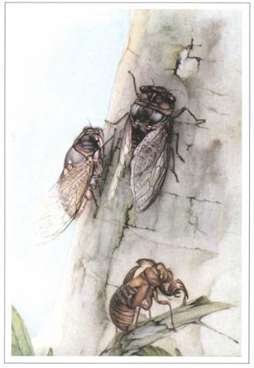 幼虫一边挖地洞,一边将尿液涂在干燥、多余的泥土上,用它那肥胖的身体将泥浆刷在洞壁上。这样湿的泥土很容易挤压,幼虫不停地挤压泥土,最湿的泥土渗到粗糙的土壤缝隙中,这样泥土就不见了,墙壁也变得光滑和坚固了,而且道路畅通无阻。这样就能解释幼虫为什么出洞时身上会有湿的泥土,在这黏糊糊的土中挖洞能不粘上一身泥吗?当你看见满身湿泥的幼虫从土里钻出来,它们就即将成为成虫了。虽然以后不用再糊墙,但它们也不会丢弃尿袋。它们会好好地保存剩余的尿液,作为防身的武器,当有敌人靠近它们时,它们会毫不客气地向敌人撒一泡尿,然后立即飞走。蝉虽然喜爱干燥之地,但根据它们在上述情形中的表现,应该被评为“优秀的灌溉家”。