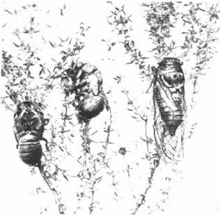为了观察蝉卵孵化的过程,我非常勤奋地工作,连续两年,用不同的工具,如盒子、试管、玻璃瓶,收集了几百条不同植物的枝条,当然里面必须是有蝉卵的。但我一直没有看见蝉的孵化过程。我的同伴雷沃米尔也感到沮丧,他把卵放在试管中,并将试管装在裤子的口袋里,想借人的体温来孵化卵。真是一位可爱的人!蝉喜欢太阳的吻,晴朗的天气对蝉来说,才是生命的源泉。