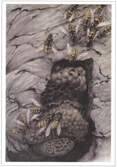 但是,我对土蜂的举动仍感到很不解。在用螫针击败金匠花金龟幼虫后,它既没有从猎物身上吸取它的体液,也没有在它身上排卵。这样的话,猎物对它来说没有什么意义。既然如此,它为什么还要进攻它们并杀害呢?也许只有一种解释,那就是:它们的行动没有意识。另外,在它们战斗的时候,土蜂的腹部末端贴在了猎物的身上。虽然猎物因螫痛多次跳起来,但是,只要在土蜂没有找到合适的攻击点之前,它的螫针是不会拔出来的。